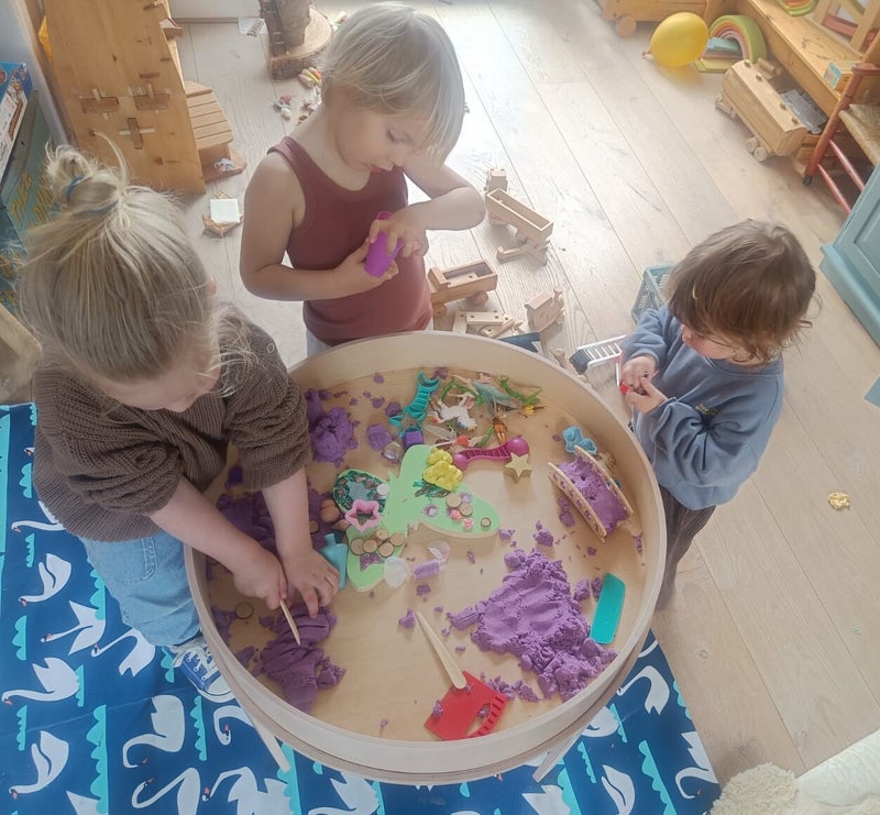 Ik leef heel erg in het moment als ik met de kinderen thuis ben. Het ritme wordt bepaald door de groep en de behoeften en waar er ruimte voor is. Meestal zorg ik wel voor genoeg eetmomentjes samen, slaapmomentjes als het nodig is, en veeeel speelmomentjes, ook altijd buiten : )